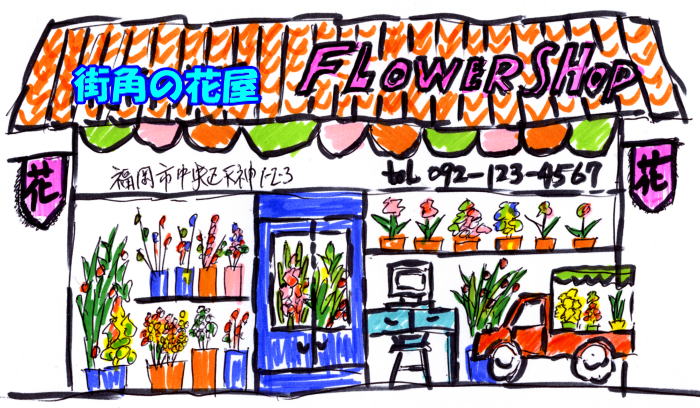 上の店は、ある町のある街角にある花屋さんです。店頭に立ってこの店のいろいろな品物を見てみよう。
