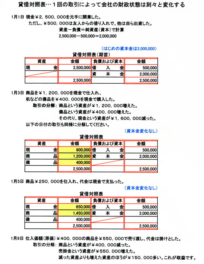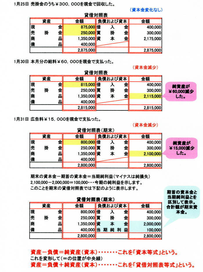 以下の取引についても、この式を使って、純資産(資本)を計算し、貸借対照表を作成していきます。 |
