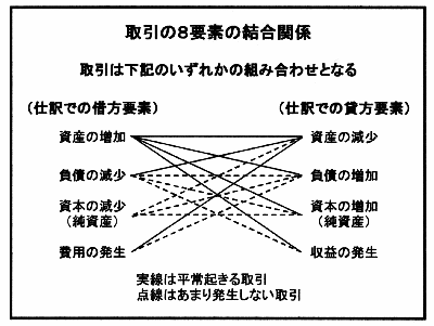 取引が発生すると、資産・負債・純資産(資本)に増加・減少という変化をもたらし、また、収益・費用の発生・消滅(収益の部分的な取り消しや費用の部分的な取り消し)をもたらす。これらの増加・減少、発生・消滅は、結局、下図のような8要素の組み合わせに落ち着く。つぎの節でそれぞれの取引を分解してみよう。