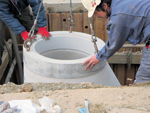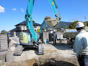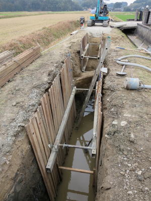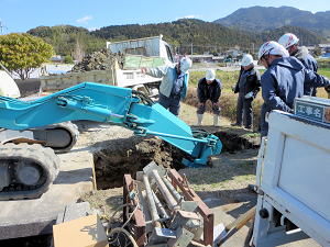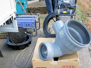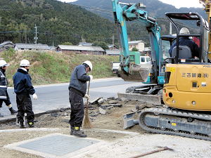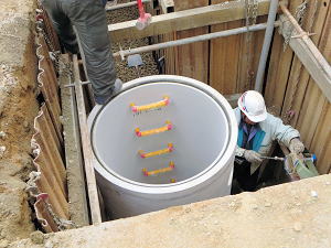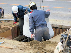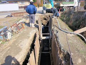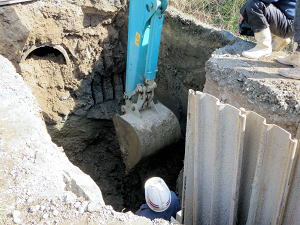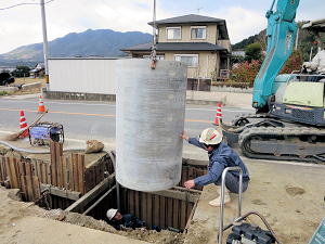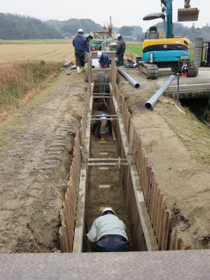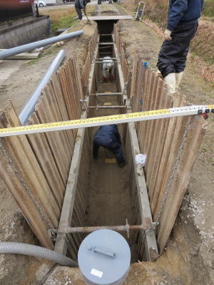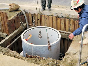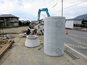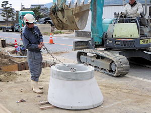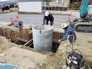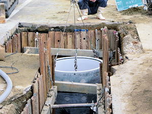 | 埋設のための溝を掘る | 大きな溜桝 | 慎重に下す、人の頭が見える |