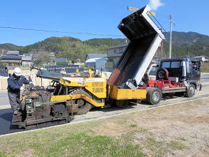 | 熱いアスファルトを引渡す | 引渡完了 | 均一の厚さに敷き詰める |